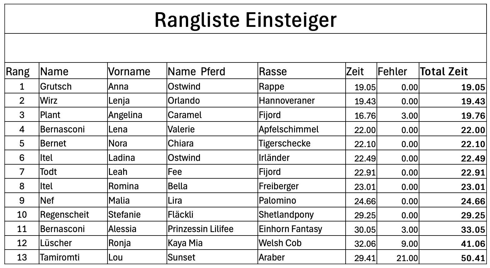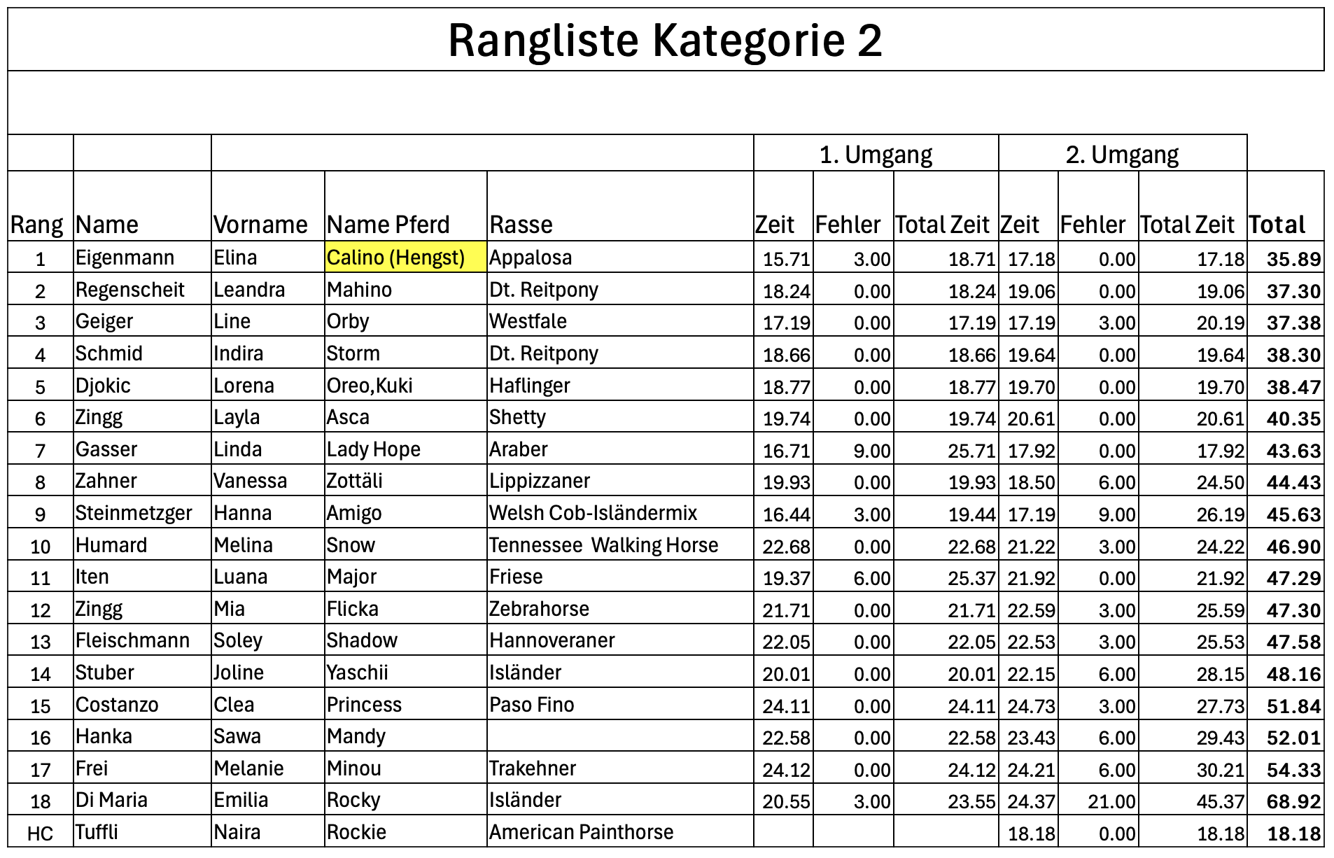 In einer Springprüfung Wertung C werden alle Fehler mit Zeitzuschlag bestraft. Die Rangliste erfolgt nach der errechneten Zeit.